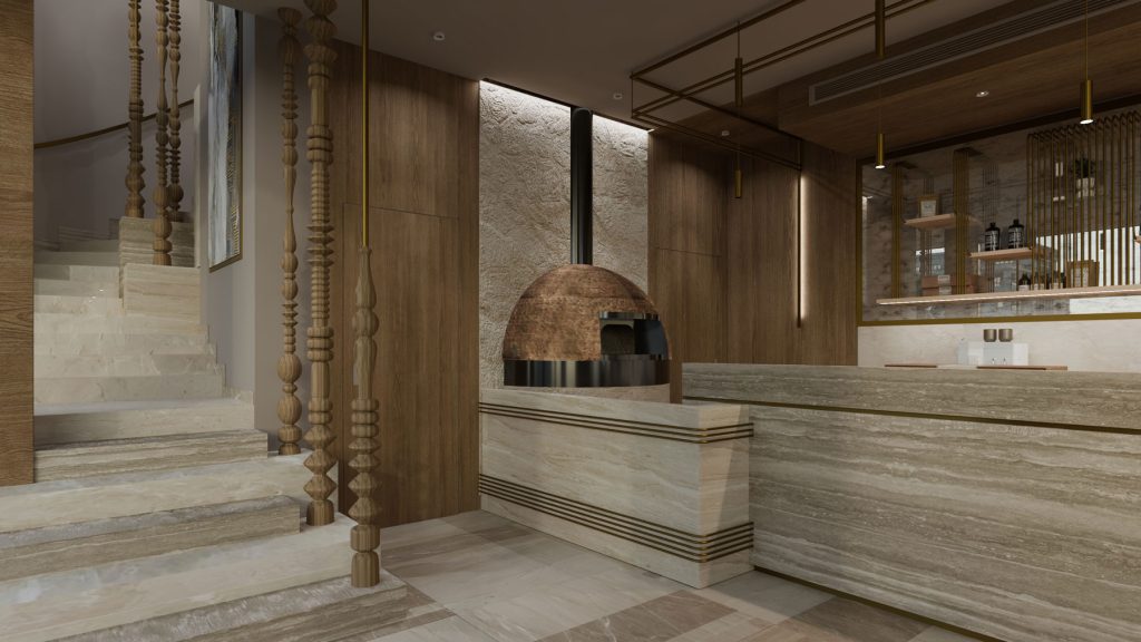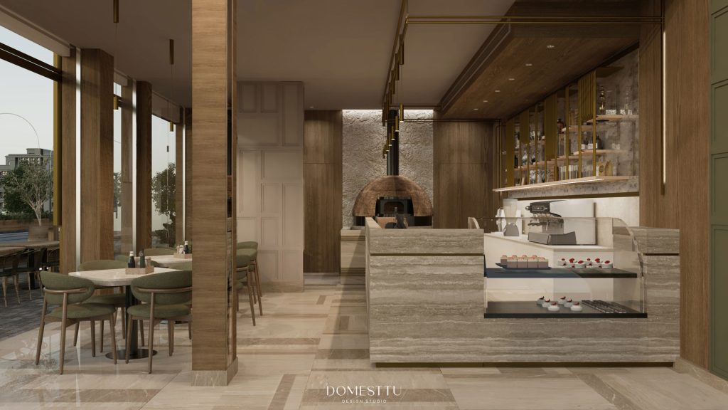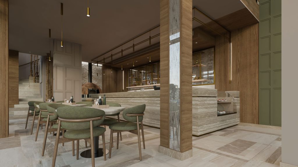thrilling challenge. We wanted to preserve its identity and create a distinctive design that could be replicated in future branches. The interior design combines natural woodwork and gold metal accents, contrasting classic and modern elements. The earthy tone of the walls and furniture enhances the elegant ambiance.